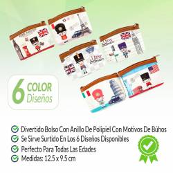 Original y juvenil monedero con anilla fabricado en polipiel con motivos de Londres, Paris y New York presentado en bolsa de celofán