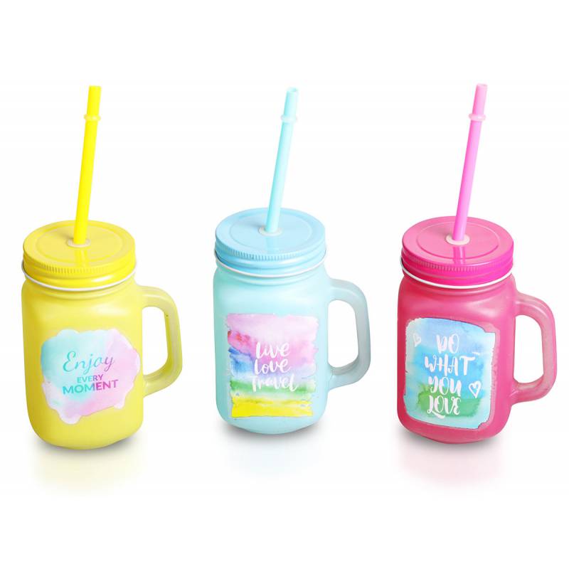 Jarra de cristal surtida en tres colores mates con frases en inglés.