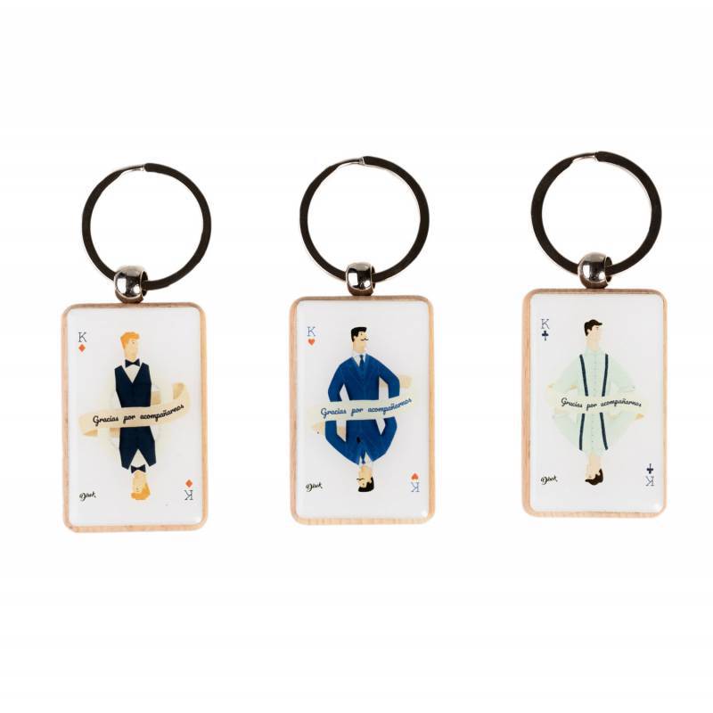 Nuevo llavero de madera con diseño de caballero inspirada en una baraja de cartas. Diseñado con la frase de agradecimiento "Gracias por acompañarnos".