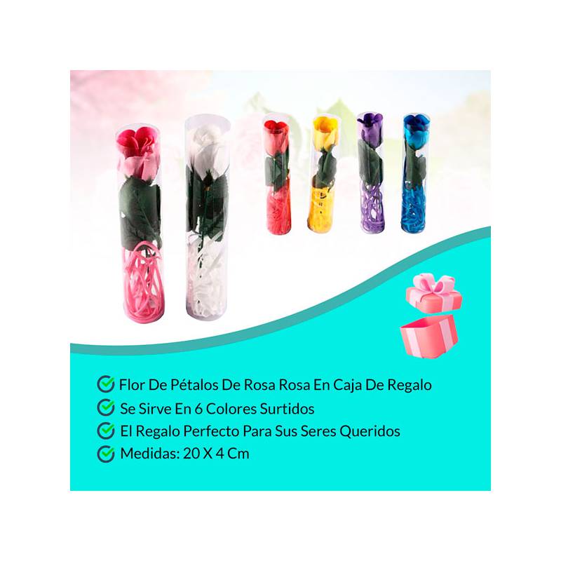 Flor Pétalos de Rosa presentados en caja de regalo, decorada en su interior con tiras de papel de color a juego