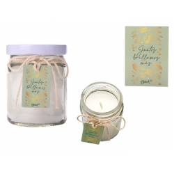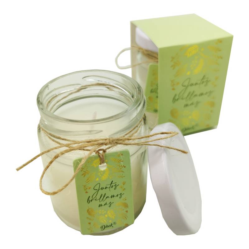 Nueva vela presentada en tarro de cristal con tapa metálica en color blanca, sobre la que cuelga una tarjeta con la frase junto brillamos más.