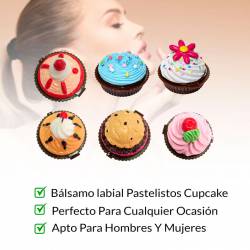 Originales pastelitos brillos labiales presentados en cupcake, estos originales bálsamos labiales harán que sus invitados tengan una brillante sonrisa y unos labios perfumados.