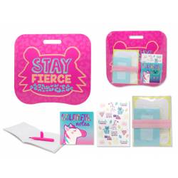 Completo set escolar para la vuelva al cole presentado en display de cartón con asa. Impresa con las frases positivas "Best Day Ever" y "Stay Fierce". El mejor día la traducción y permanece feroz.